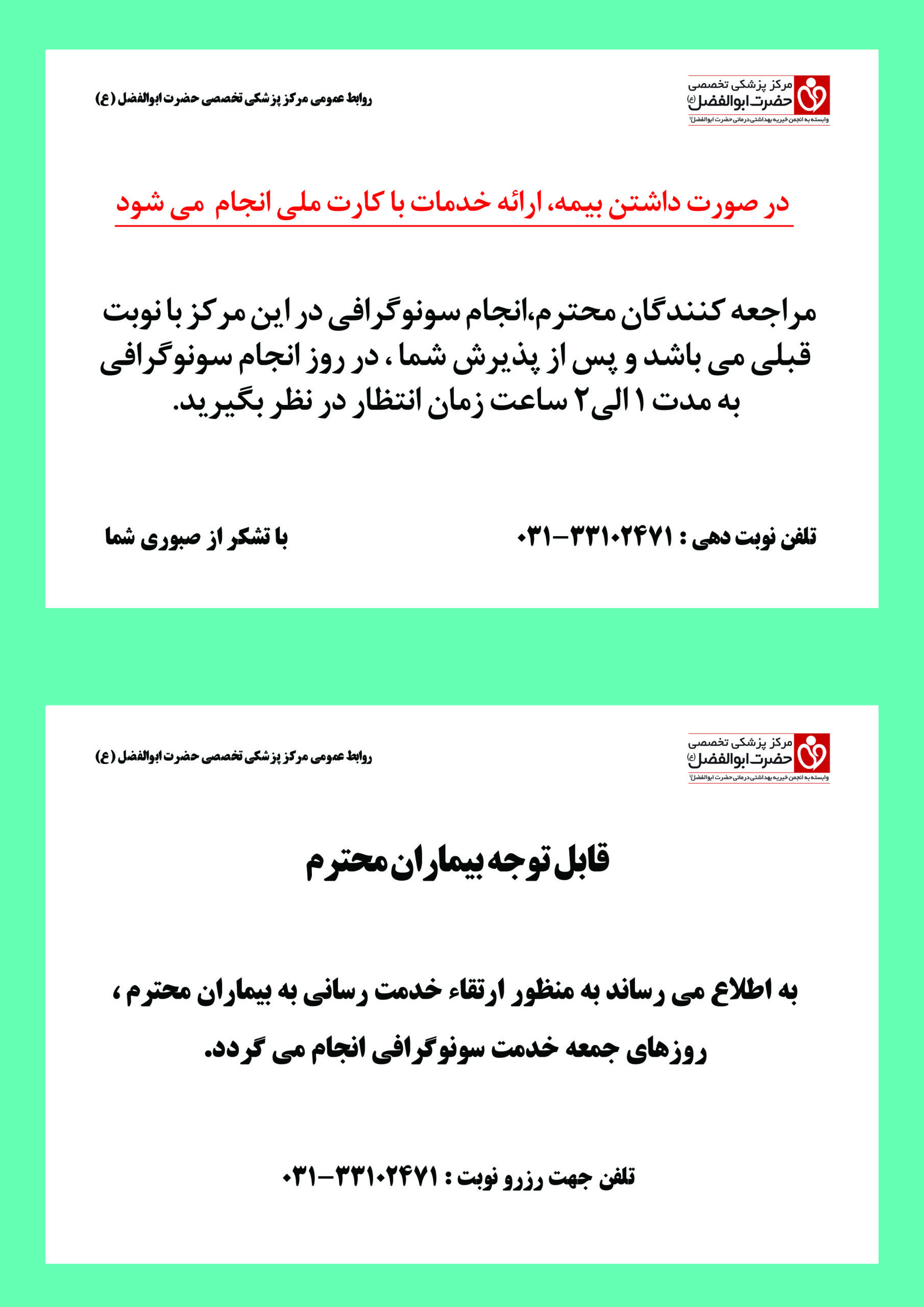 لازم به ذکر است با رزرو نوبت، رادیولوژیست خانم و آقا جهت سونوگرافی در مرکز حضور خواهند داشت.