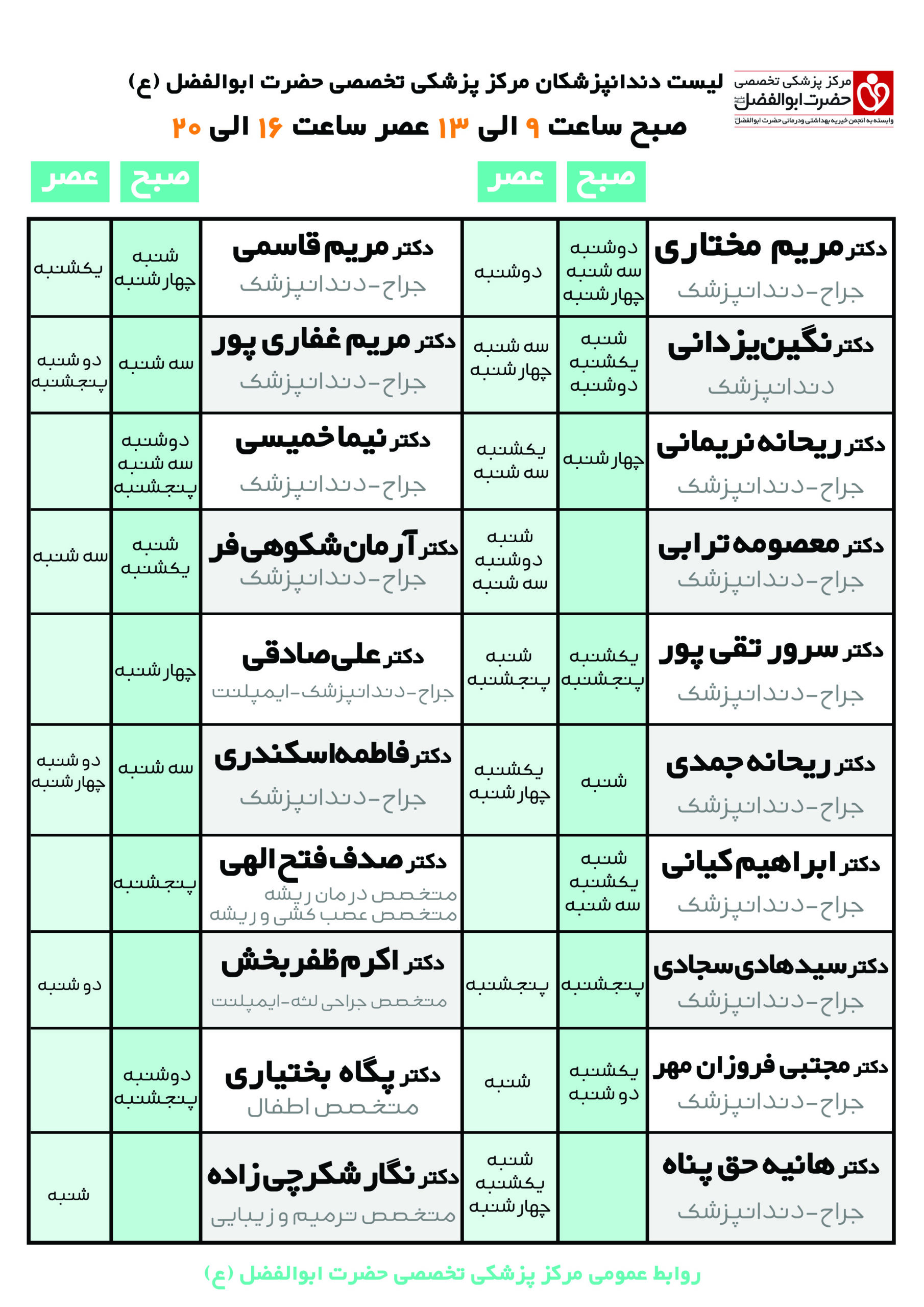 واحد دندانپزشکی مرکزپزشکی تخصصی حضرت ابوالفضل (ع) با تجهیزات پیشرفته و بهترین متریال در اتاق و یونیتهای مجزا در دو بخش بزرگسال و کودکان، همه روزه در دو شیفت صبح و عصر و جمعهها فقط در شیفت صبح در زمینههای زیر در حال خدمترسانی ویژه میباشد: